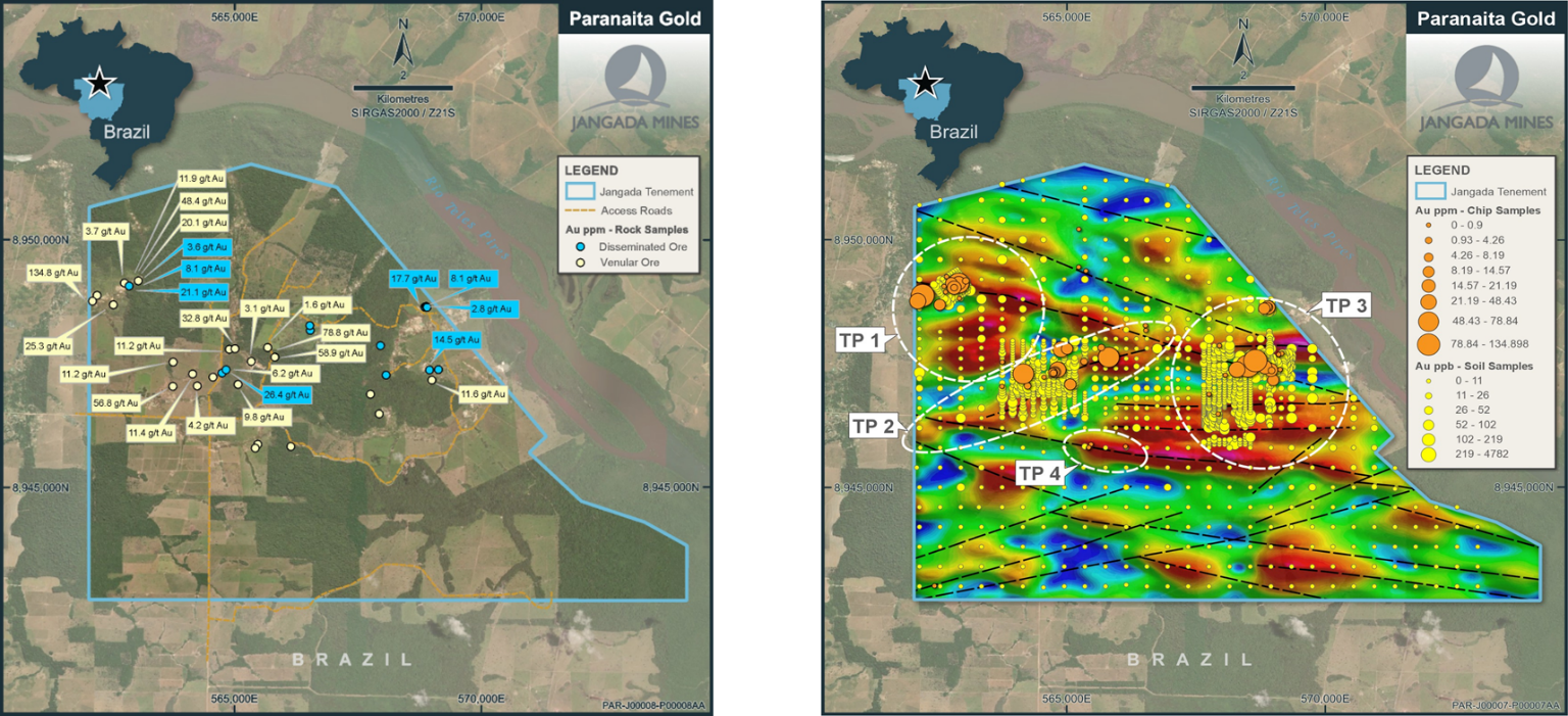 Gold (with associated copper) mineralisation at Paranaíta is primarily disseminated within granitic rocks. It is linked to syn-magmatic and syn-tectonic events, as well as overlapping hydrothermal and epithermal processes. Early-stage mineralisation is typically associated with potassic-altered granites or feldspar-rich hydrothermal rocks, featuring disseminated sulfides and gold with only minor hydrothermal overprint. This is subsequently overprinted by more advanced quartz-sericite-pyrite (QSP) alteration, which forms stockwork-style vein systems and enhances mineral concentration.
