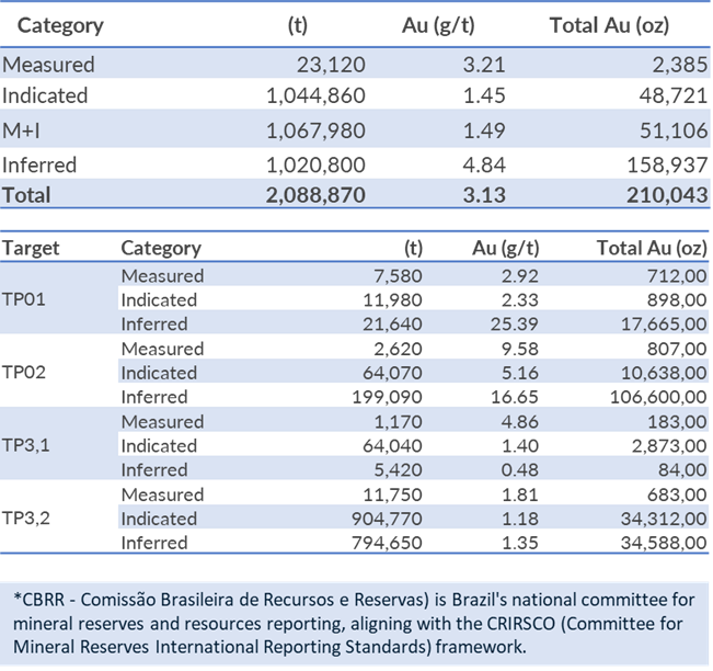 A resource estimate reported according to the guidelines of the CBRR (equivalent in Brazil to CRIRSCO, the Committee for Mineral Reserves International Reporting Standards), currently stands at 210,043 ounces Au, but importantly there are multiple mineralised structures with open drill targets in all directions and along the 8km mineralise corridor.