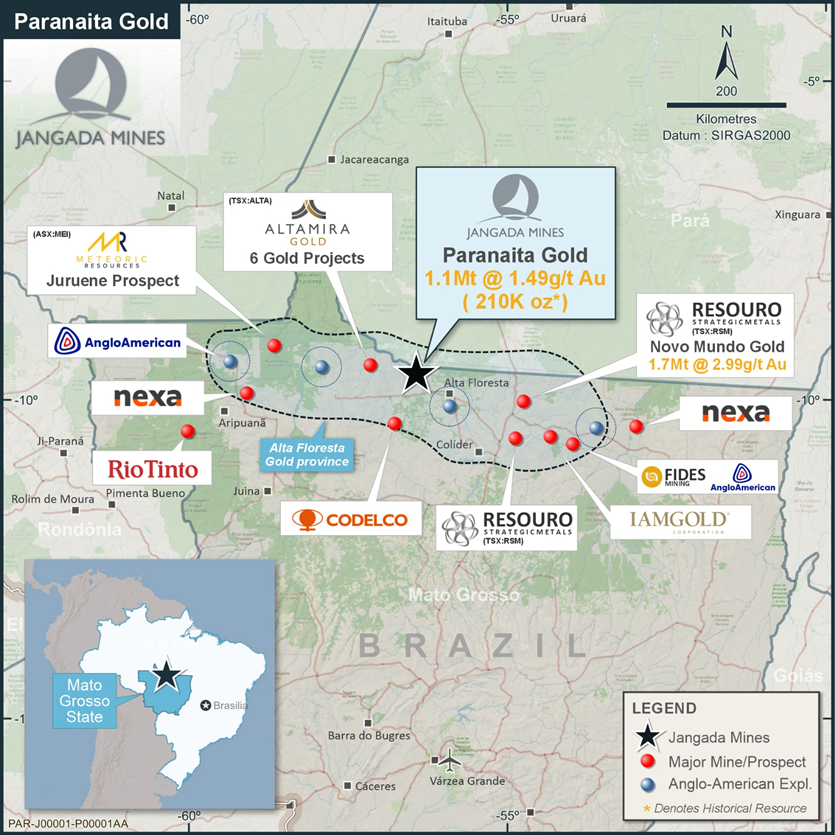 The 7,211-hectare Paranaíta Gold Project is located in the Alta Floresta - Juruena Gold Province (AFGP), a prolific gold-producing region with excellent infrastructure, and a history of 7–10 million ounces of gold output and over three decades of artisanal mining. Interpreted as a gold-rich porphyry-epithermal system, the Project resembles other intrusion-hosted deposits like X1 and Pé Quente and is set within a structurally complex zone marked by multiple mineralised trends and extensive surface workings.
